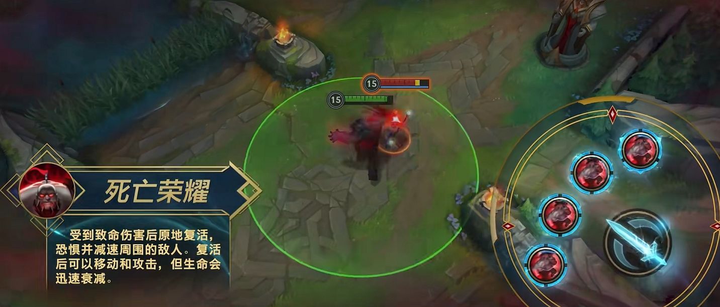 复活之后的赛恩可以移动和进行攻击,但是血量会快速降低,期间所有的主动技能都将替换为死亡冲动,并且获得移动速度的加成。这时的赛恩就相当于一部杀戮的机器,可以造成非常恐怖的输出,所以在使用赛恩的时候,千万不要惧怕死亡,冲在第一线才能够带来最大的收益。