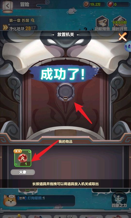 但是正确的操作步骤需要玩家们优先移动到石狮子机关前面的格子,点击石狮子机关就可以直接点击取出,然后就可以放置机关,金象、水象、木象、火象是分别对应着四个石狮子的,玩下面在前面的冒险途中是可以获取这些物品的,直接将上面的四个道具拖动到丢失的圆圈内即可通关。
