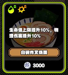 就比如南瓜甜汤面,小伙伴们吃它的话需要消耗两千丁尼,吃完以后将能获得百分之二十的血量上限加成;而如果是炸叉烧面的话,就需要花费三千丁尼了,其效果则是提供百分之十的血量上限加成、以及百分之十的物伤加成。