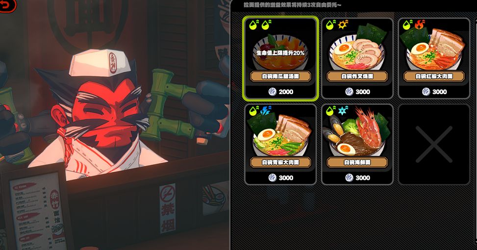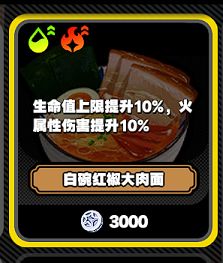 再比如,小伙伴们选择的是红椒大肉面,它同样需要花费三千丁尼,但是除了百分之十的血量上限加成以外,还能提供百分之十的火系伤害加成。