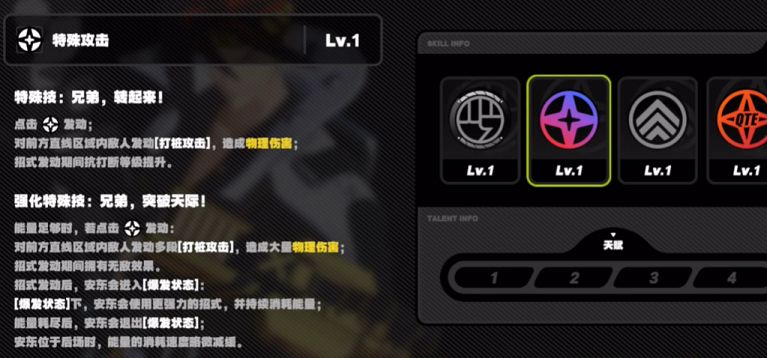 他的特殊技是对前方支线区域内的敌人发动攻击,造成物理伤害,在招式触发期间会有抗打断等级的提升。强化特殊技特使向前方发动攻击,造成大量的物理伤害,在招式发动之后,安东会进入爆发状态,在这个状态下,安东可以使用出更强力的招式,会持续消耗能量。在能量用完只有就会退出爆发状态,安东位于后场时能量的消耗速度会减缓。