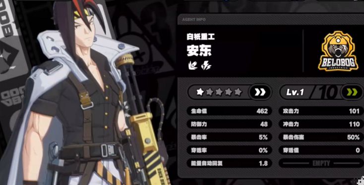 安东初始属性比较一般,生命值为462,攻击力为101,防御力为48,冲击力为110,暴击率为百分之五,暴击伤害为百分之五十,穿透率没有,制动回复为1.8。