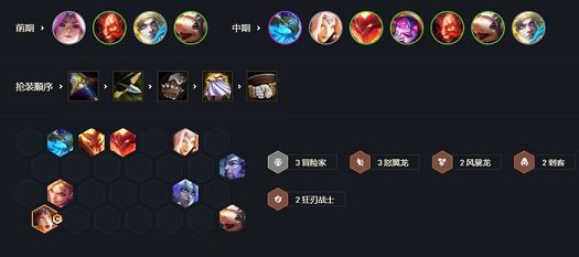 这套阵容大家应该也是不陌生的,毕竟从s7赛季一开始就是非常热门的打法。这一套的打法其实也是很简答的,利用冒险家的全员加持效果,搭配上强力的单卡组建羁绊,从而大幅度提升阵容的整体强度。