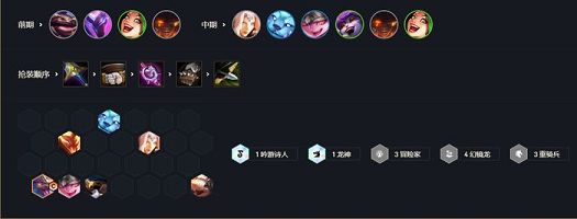 阵容组成如上所示,这个算是目前版本最强的阵容了,此前的版本幻境龙强度很低,随着加强之后伤害大幅度提升。主要羁绊就是冒险家的羁绊可以增加全队的战斗力,同时龙神迭嘉作为游戏当中的核心输出,同时搭配上幻境龙的羁绊加持,进一步提升输出伤害以及上限。