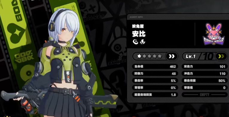 安比初始生命值为462,攻击力为101,防御力为48,冲击力为110,暴击率为百分之五,暴击伤害为百分之五十,没有穿透率和穿透值,能量自动回复为1.8。