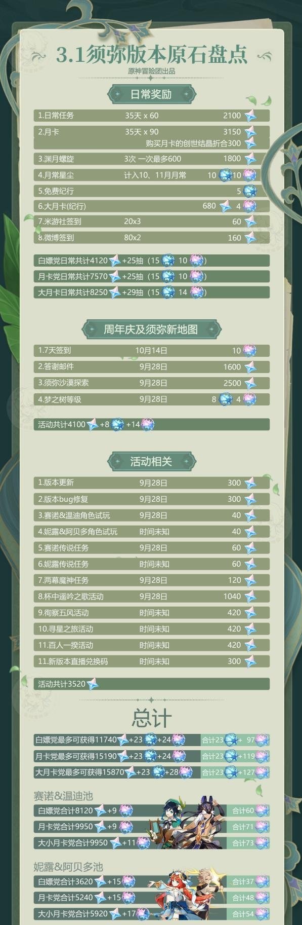 强调:3.1版本的须弥的内容根据3.0版本的须弥情况进行了估算,而且未知成就等难以统一的部分未列入表中,所以预计大家实际能够获取的原石数量会比统计数高一些。