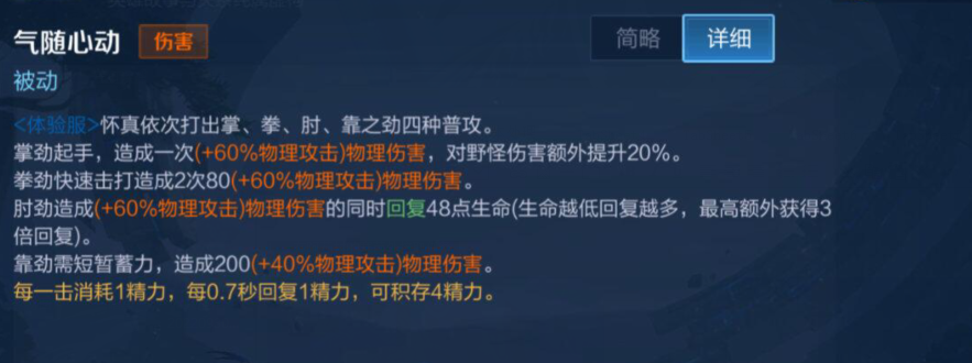 掌劲起手,造成一次(+60%物理攻击)物理伤害,对野怪伤害额外提升20%。