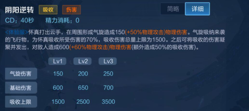 怀真打出云手,在周围形成气旋造成150(+ 50%物理攻击)物理伤害。气旋吸纳来袭的飞行物,为怀真吸收所受伤害的70%,吸收伤害总量上限为1500。之后可将吸收的伤害凝聚并发出,对敌人造成600(+60%物理攻击)物理伤害(额外造成50%的吸收伤害)。