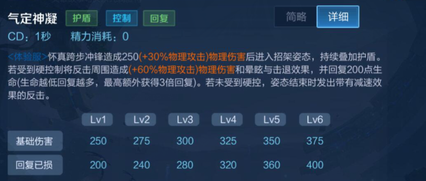 怀真跨步冲锋造成250(+ 30%物理攻击)物理伤害后进入招架姿态,持续叠加护盾若受到硬控制将反击周围造成(+60%物理攻击)物理伤害和晕眩与击退效果,并回复200点命(生命越低回复越多,最高额外获得3倍回复)。若未受到硬控,姿态结束时发出带有减速果的反击。