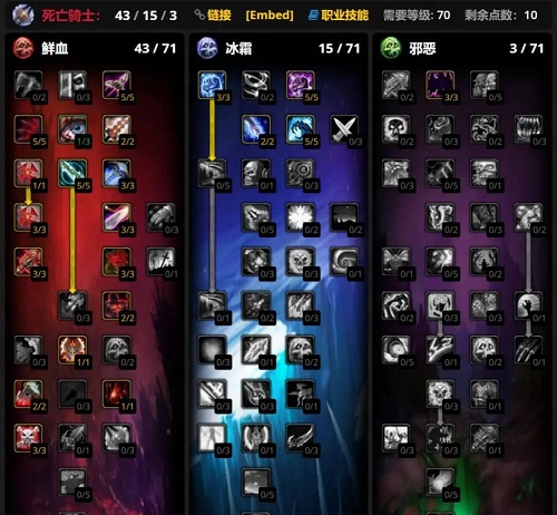 第一套是43/15/3,这是强化了冰触的单拉天赋加法,能提供超高的仇恨输出。鲜血系点出了必备的大墓地,然后在冰霜系投入了15点加强冰触射程与冰霜伤害。邪恶系的3点命中天赋是必备的。