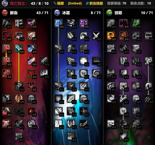 第二套是43/8/10,与第一套天赋的区别在于强化了邪恶系的疾病持续时间,同时点出凋零减冷却时间15秒,这在5H相当关键,而且多出了两点躲闪天赋。