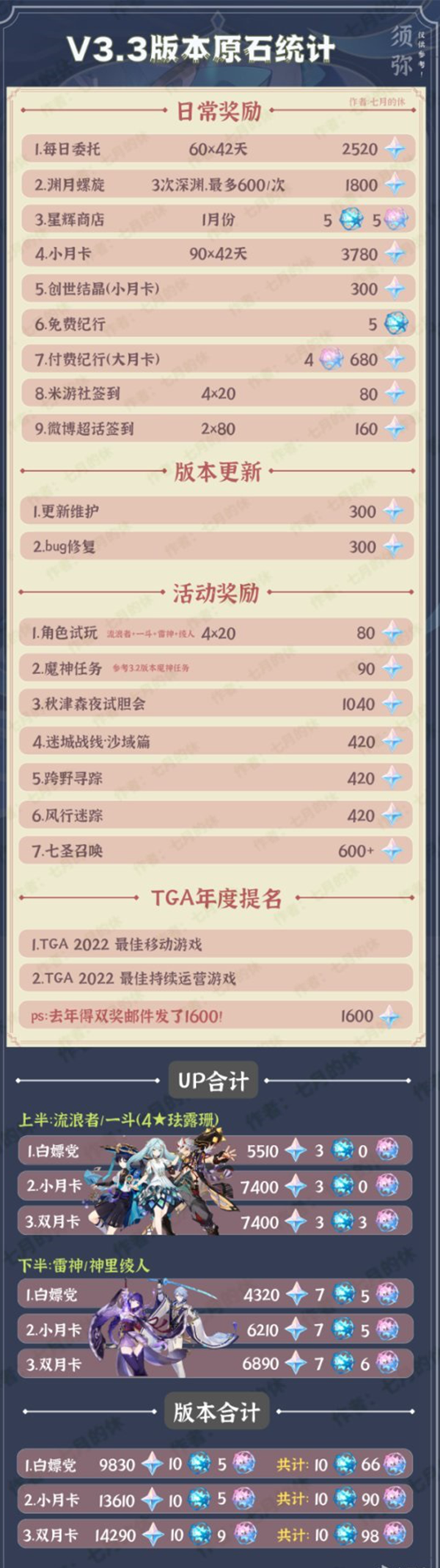 5. 关于七圣召唤这个常驻玩法,楼主这里参考了尘歌壶等级奖励为600,但是尘歌壶还有角色赠礼目前有超过2000原石了,所以因不清楚具体规则,所以这里写600+,上下半各分一半!