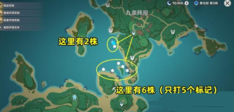 6、在九条阵屋南边的海滩上,从九条阵屋的传送点向南飞,遇到一棵会不断放电的树。附近共有6颗海灵芝其中2株比较接近,所以只标注了5个标记。