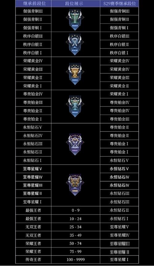 青铜、白银、黄金段位继承:青铜、白银段位不变,黄金段位掉一个小段(不会掉到白银)。
