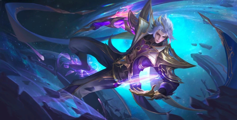 上衣带有燕尾形式的华丽衣摆设计,在色彩搭配上,背部布料散发紫色渐变光芒,当暃踏玉飞檐之时,蓝色衣摆随风起舞,紫色流光若隐若现,展现出他潇洒不羁的身姿。