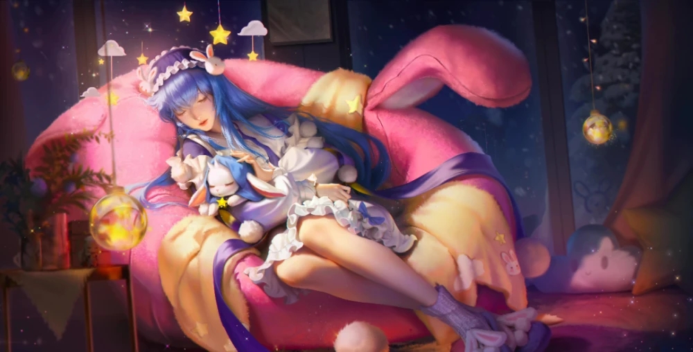 形象设计上,我们围绕舒适柔软的原则,将云朵般的棉球、软糯小兔装饰在头上的居家发带、飘带两侧和棉拖鞋上,云朵星星挂饰摇曳在她周围,使得人物整体充满温暖、可爱的气质。