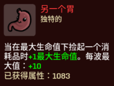 1. 另一个胃:游戏补丁将每回合上限修改为10个,无法再无限进食。尽管如此,它仍然具有强大的功能。我在20关后获得了这个道具,在无尽模式的前期,每回合10点生命值的保障使其具有很高的实用价值。
