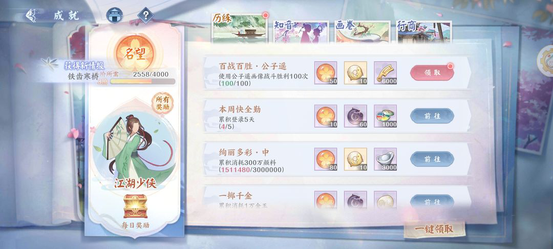 除了上述几种比较常规的礼物外,公子遥平日里还喜欢抚琴品茗,虽然游戏中暂时无法获得琴类的礼物,但还是可以获取碧潭飘雪这种特殊的茶叶来送给公子遥作为礼物,这种充满诗意的茶名和这个翩翩君子也极为相衬,各位如果入手建议第一时间送给他。