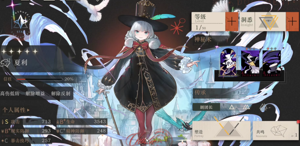 二技能也是一个单体攻击和一技能不同的是当释放该技能时,角色受到伤害达到50%以下,可以进行技能的爆发。属于夏利这个角色,所有技能中最强大的一个单体攻击技能,能在一级的时候就达到250%的精神伤害。三技能是一个群体攻击能在该技能释放的时候将队友角色受到的所有控制效果进行反制,并对敌人造成250的精神伤害。