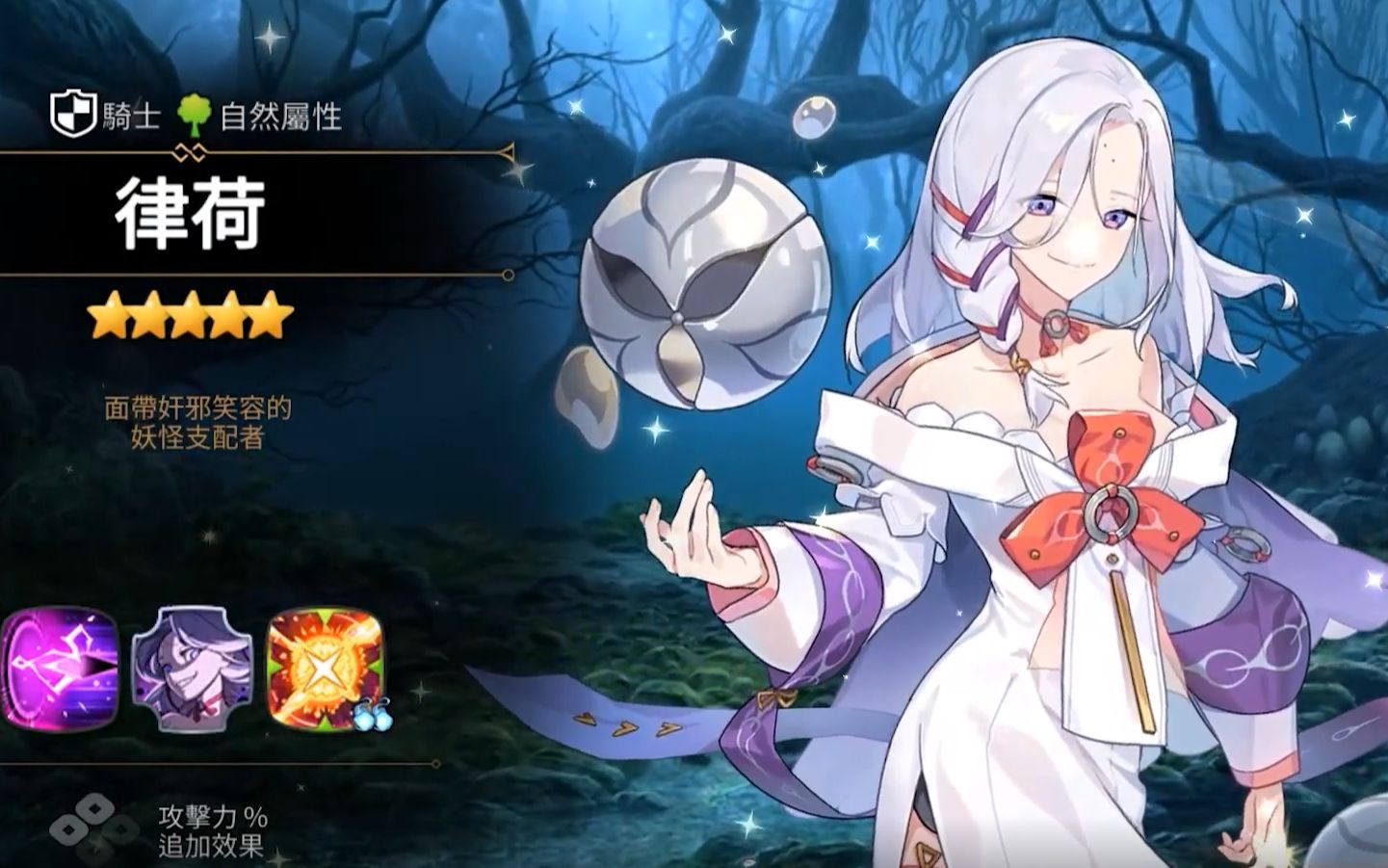 必杀技能:恶魔之舞,攻击所有敌人,并根据自身生命值百分比提升伤害量。如果敌人处于指定挑衅状态,则额外造成50%伤害,并延长指定挑衅状态1回合。这个技能可以造成大范围的高伤害,并且可以延长控制效果,是律荷的核心技能。