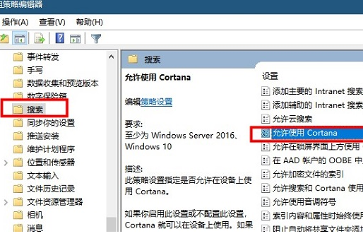 3、接着点击左侧中的"搜索",然后找到右侧中的"允许使用Cortana"双击打开。