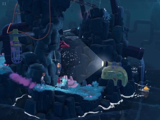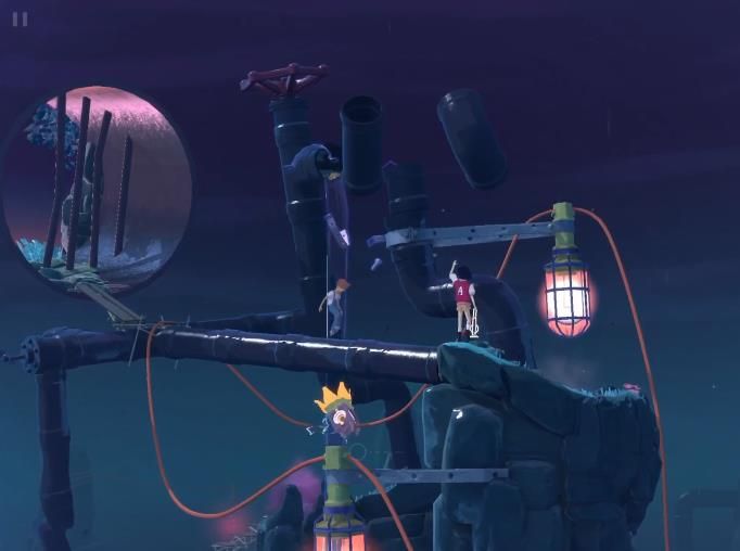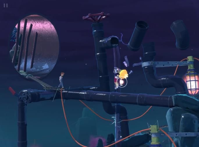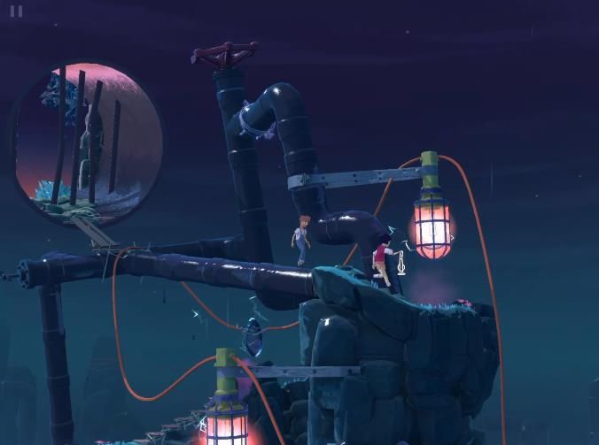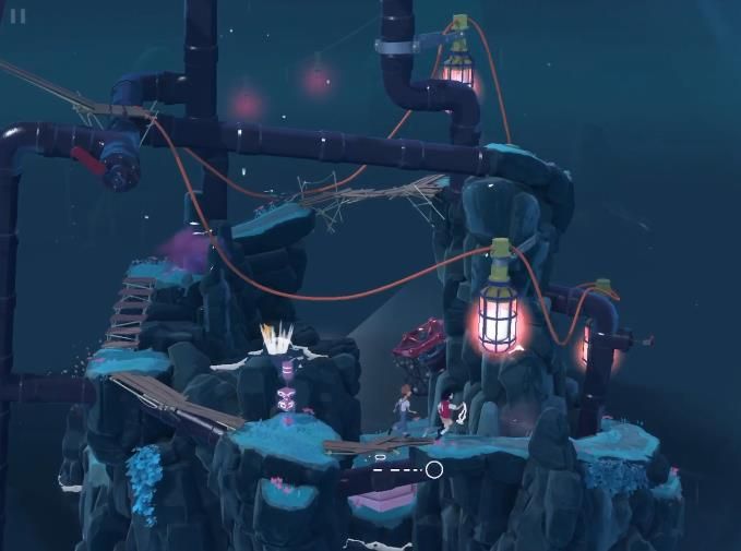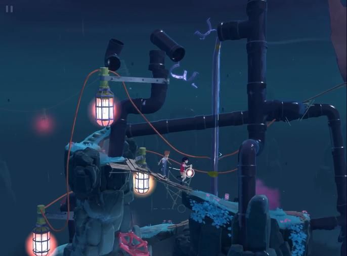 2、我们一直往下走,走到第一处迷雾处,将视角转过来,然后水滴就会连接电线,等灯亮了后迷雾就会散去,然后就可以过去了。