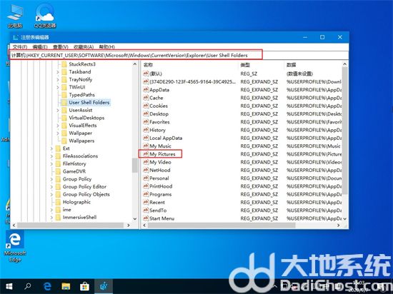 2、在注册表编辑器中,按照“HKEY_CURRENT-USERSoftwareMicrosoftWindowsCurrentVersionExplorerUserShell Folders”路径依次展开,然后在窗口右侧双击打开“My Picture” ;