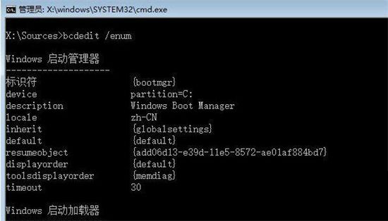 9、全部操作完成后,再输入一次“bcdedit /enum”并回车,如果出现图示结果就说明修复成功了。