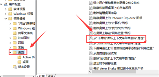 3、接着点击“桌面”选项,找到右侧中的“从计算机图标上下文菜单中删除属性”双击打开。