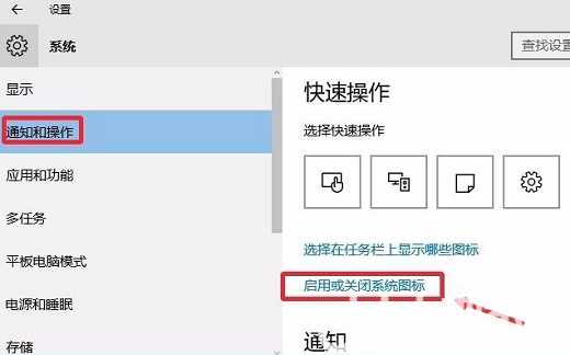 3、通知和操作中我们点击这里的启用或关闭系统图标。