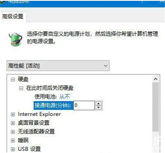 5、然后我们在开关电源选项窗口,将电脑硬盘下改动在这里时间后关闭电脑硬盘为0,0即不关闭电脑硬盘,随后确定保存。