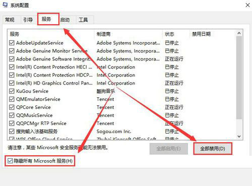 6、切换到【服务】界面中,勾选下方的【隐藏所有Microsoft服务】,点击【全部禁用】,然后点击确定,然后重启电脑