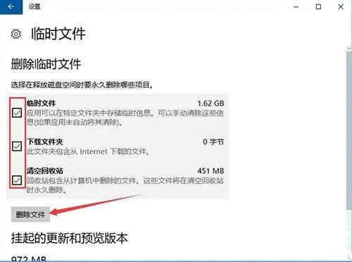 6、第六步进去临时文件界面之后,勾选上临时文件,下载文件夹,清空回收站,旧版Windwos,点击删除文件,如下图所示: