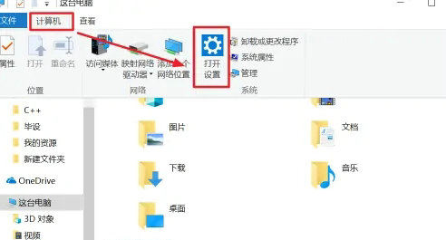 2、进入【此电脑】后,找到工具栏中的【计算机】,接着点击【打开设置】这个选项