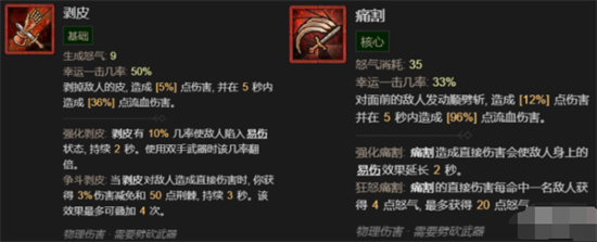 这个方法最好在难度1以下使用,对于新手野蛮人或者操作不太流畅的玩家来说是最好的入门手段,通过剥皮提供的荆棘和痛割的流血+回能,我们能比较轻松的清理小怪,精英也可以挂流血然后走位躲技能来慢慢磨死。