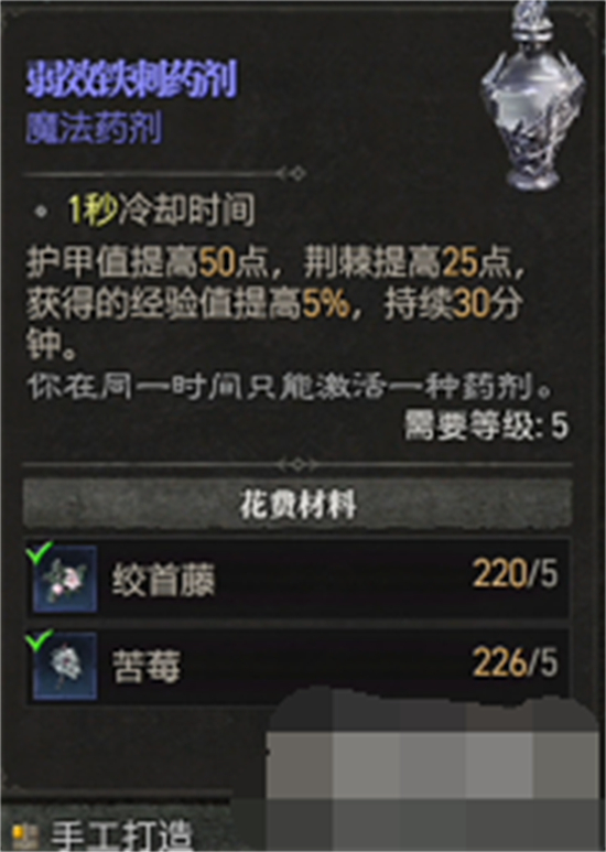 这个打法还能通过在主城制作药水来强化,虽然给的荆棘护甲不多,但前期还是有点用的,当然我们前期喝药的最主要目的还是5%额外经验。