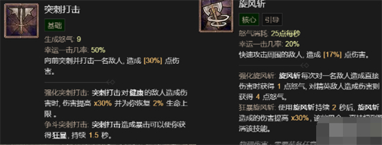 这个组合的核心其实是突刺打击,这个技能可以帮助我们完成小位移+回血,后期还能帮我们触发狂暴。
