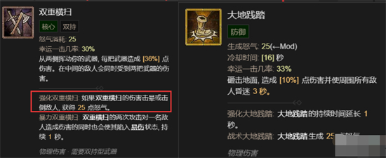 双重横扫一级强化的实际效果是【使用双重横扫命中一个处于昏迷或者倒地的敌人时,会恢复25点怒气】而这个技能本身的怒气消耗也只有25点,所以只要配合大地践踏,我们就能在前期实现怒气自由。同时大地践踏的昏迷效果也能让我们输出更加安全。