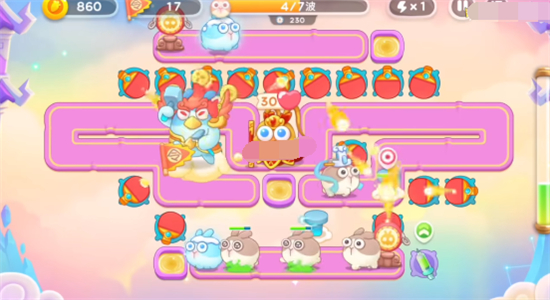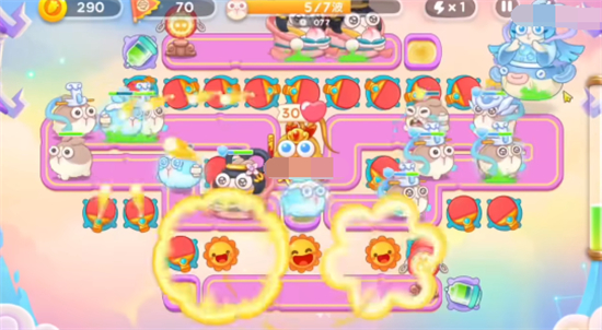 4、注意还有冰冻兔,被冻动的炮塔要及时打掉,粉兔的数量也有点多,注意不要漏掉,第二个是其余的神仙,可以锁头打,可以下起点都放毒针,下面位置补几个太阳,之后还有拿葫芦的神仙,还是顺着路线放炮塔就行。