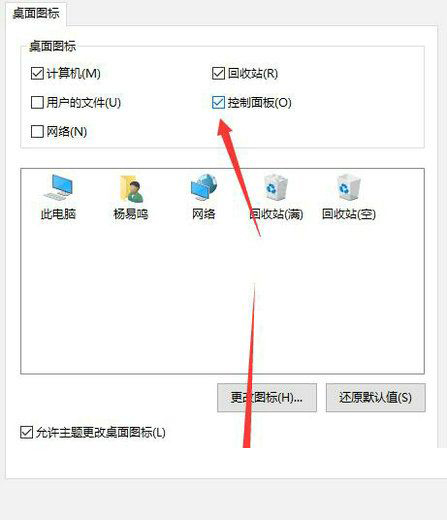 4、然后勾选上“控制面板”,点击“应用”,然后确定以后,就能够将控制面板放置在桌面上了。