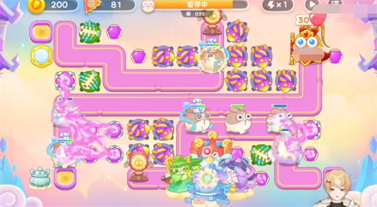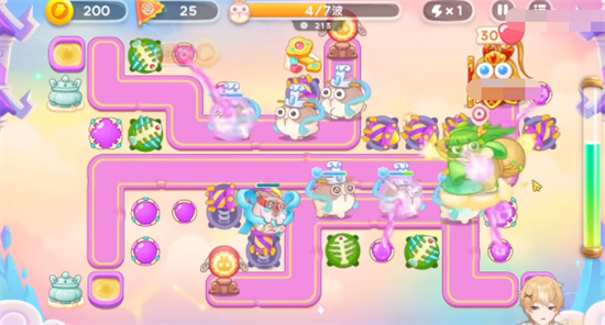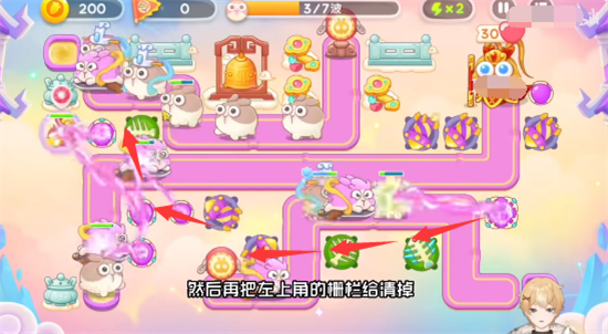 4、第一个神仙是拿葫芦的,玩家可以锁头打,顺着路线放炮塔,在右上角萝卜边上多放烟花炮,有飞飞兔,打完之后是合体神仙,这个有点难,不怎么能锁头,还有粉兔别漏掉了。