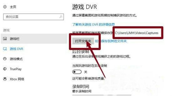 4、进入后,点击【游戏DVR】,在右边就可以看到保存位置了,点击【打开文件夹】(如图所示)。