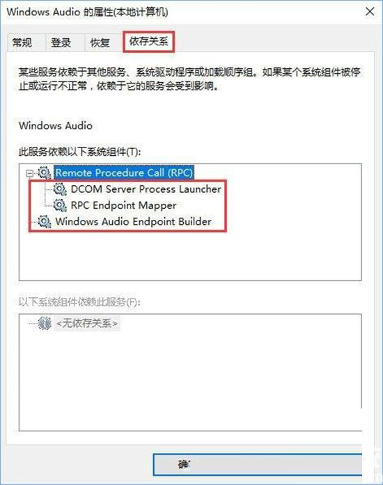 1、首先进入服务双击打开Windows audio属性,在“依存关系”选项卡中可以看到所依赖的3个服务名称,如图。