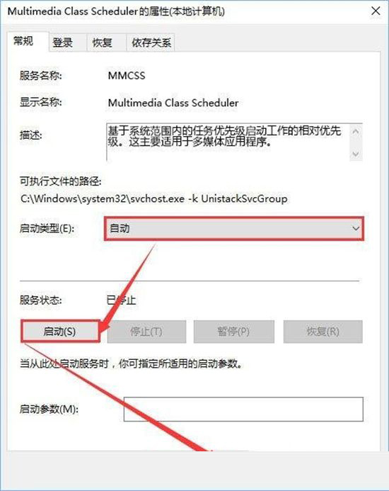 3、把“启动类型”设置为“自动”,点击确定,之后就启动按钮就可以点击了,将该服务打开即可。