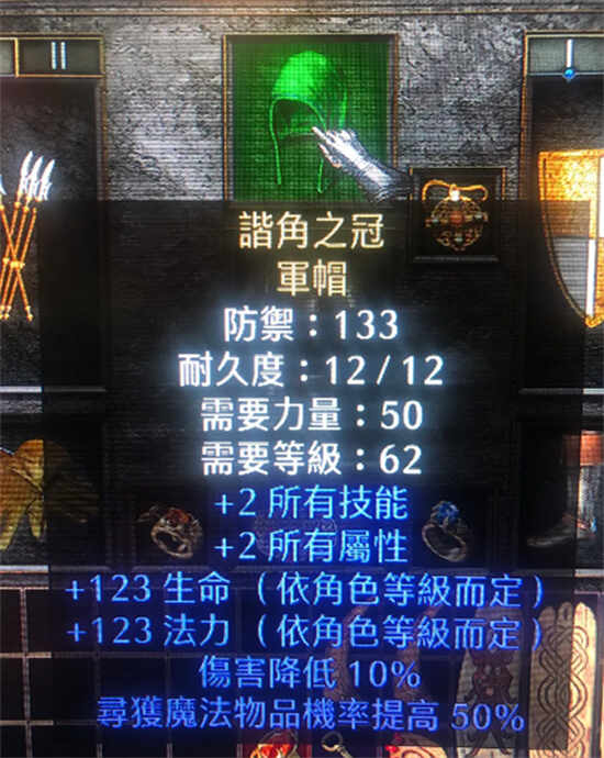 更不要说军帽还有一大堆的使用效果,全面提升生命值、全属性,获得额外的减伤和冷却缩减,还能提升材料掉率,这件装备成了玩家必备的工作装,无论是哪个水平的玩家都需要它,其他暗金或者传奇头盔与它相比都逊色许多。