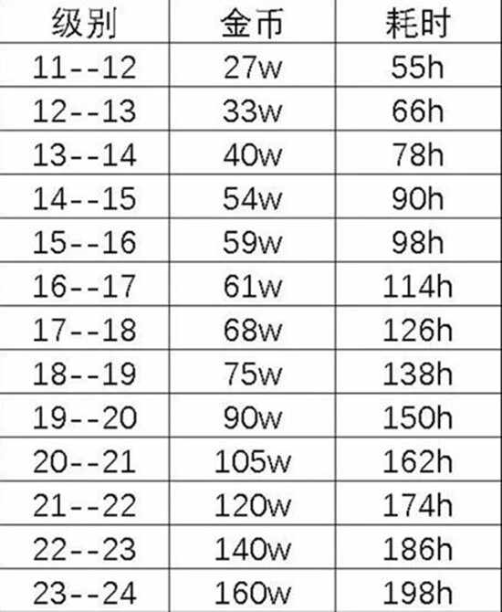 23级升到24级:需要160w金币,升级消耗198小时。