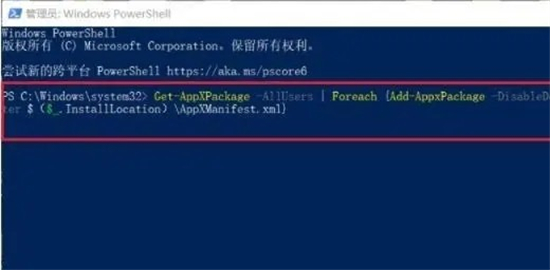 “Get-AppXPackage -AllUsers | Foreach {Add-AppxPackage-DisableDevelopmentMode -Register “$($_.IntallLocation)\AppXManifest. ”}”。