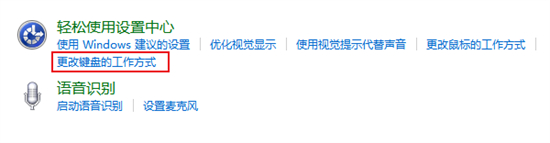 3、在“轻松使用设置中心”点击“更改键盘的工作方式”。