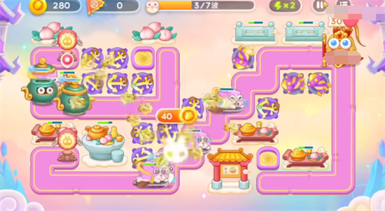 2、把附近的钱袋都优先打掉,放船锚炮即可,右侧区域靠萝卜的位置多放几个烟花炮,之后优先清理左上角的道具,清完都放船锚炮,左下角也是都补满船锚炮;