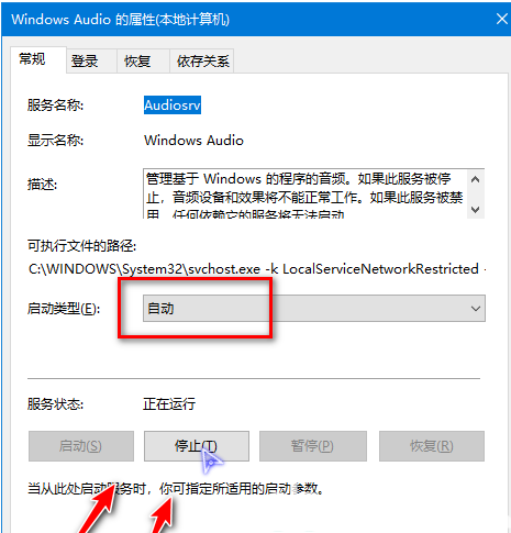 4、出现下图所示窗口后,查看“启动类型”是否为“自动”,如果是的话,就依次点击“停止”-“启动”。在更改启动类型后,一定要记得点击“应用”和“确定”。